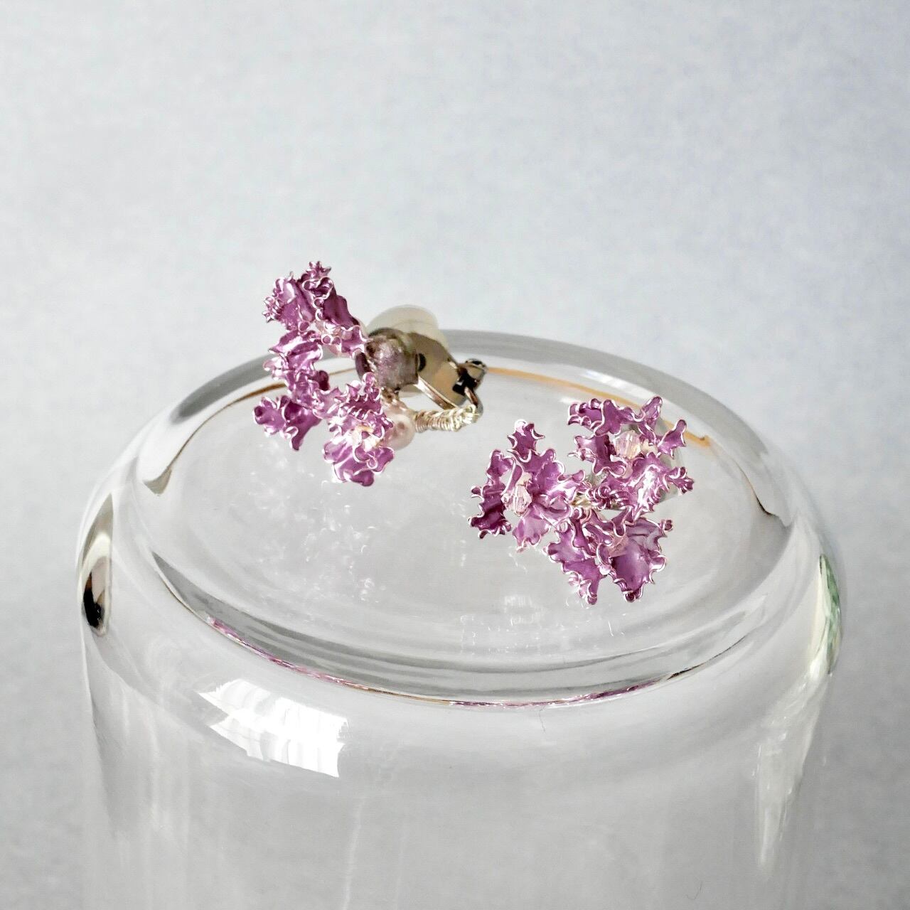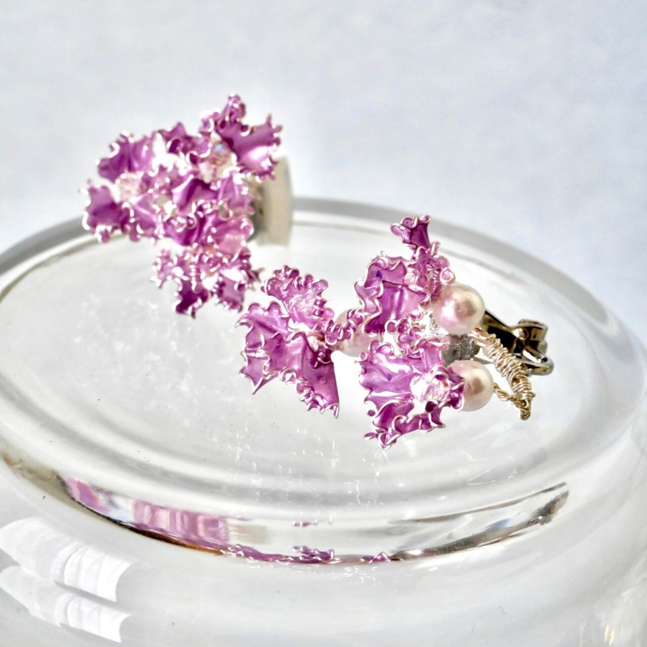 お花をまとめて束ねている根元を、耳飾り金具と逆方向に力を加えるとパーツごと外れる場合がございますので優しくお取り扱いください。